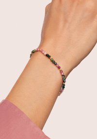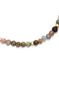 De magie van natuursteen nu om je pols. Deze armband van natuurlijke toermalijnstenen van verguld staal geeft een kleurrijk en boho tintje aan al je looks.