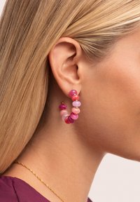 De Rosé Stones Oorbellen zijn middelgrote, half-open hoepels gevuld met grote roze stenen. Ze zijn origineel, romantisch en perfect voor de herfst.