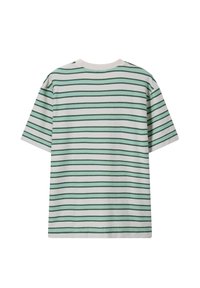Man draagt een wit T-shirt met groene horizontale strepen en bruine broek, kijkt naar beneden met hand op de heup tegen een beige achtergrond.