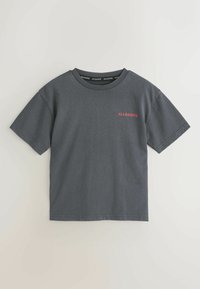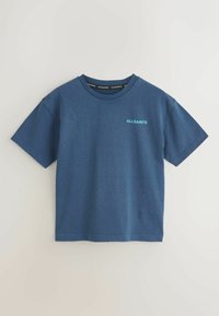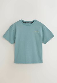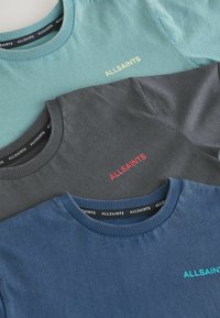 Drie T-shirts met ronde hals in donkergrijs, licht teal en donkerblauw, elk met "ALLSAINTS" gedrukt op de linkerborst in bijpassende kleuren.