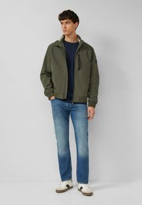 Jonge man die een olijfgroene bomberjack draagt over een marineblauw shirt en een blauwe spijkerbroek, staand met één hand in de zak tegen een effen grijze achtergrond.