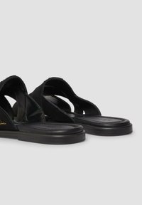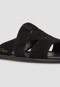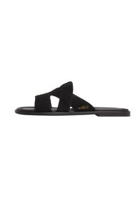 Zwarte platte slipper met brede suède banden die over de voet kruisen en een klein gouden merkembleem aan de zijkant.