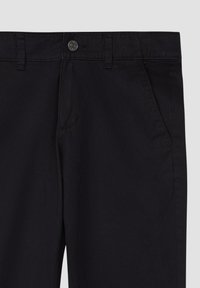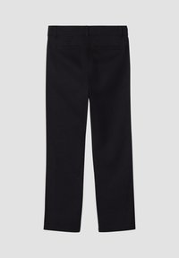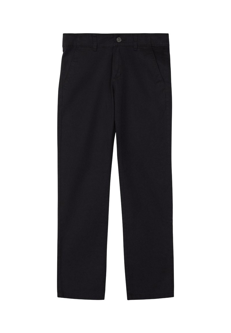 Zwarte katoenen broek met een rechte pijp, voorzakken en een metalen knoopsluiting in de taille.