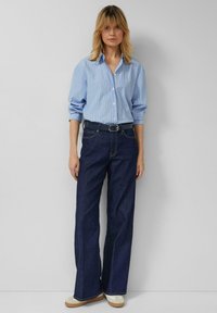 Lichtblauw overhemd met witte strepen en kleine stipjes, losse pasvorm, opgerolde mouwen, gecombineerd met donkerblauwe spijkerbroek en een blauwe riem.
