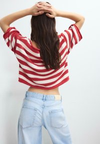 Rood-wit gestreepte cropped sweatshirt met lange mouwen, voorzien van een geborduurd detail op de borst, gecombineerd met donkerblauwe jeans.