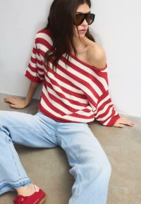 Vrouw die een rood-wit gestreepte off-shoulder trui draagt, lichtblauwe wijd uitlopende jeans, rode sneakers en oversized zonnebril, staand tegen een witte muur.