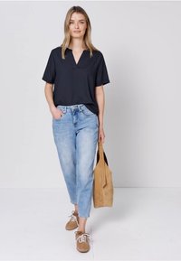 Lachende vrouw met een zwarte blouse met korte mouwen en blauwe spijkerbroek die een opgevouwen bruine jas vasthoudt tegen een effen achtergrond.