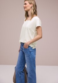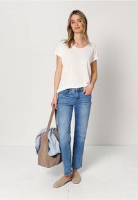 Lachende vrouw met een wit topje met korte mouwen en blauwe spijkerbroek, met een gestreepte tas naast zich tegen een neutrale achtergrond.