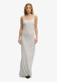 Vrouw staand, gekleed in een witte maxi slipjurk met dunne bandjes en kleine blauwe bloemenprint, gecombineerd met zwarte schoenen.