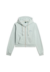 Navyblauwe zip-up hoodie met een cropped ontwerp, voorzien van voorzakken en witte logo-geborduurd; gecombineerd met bijpassende sweatpants.