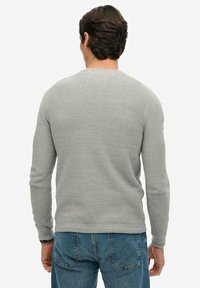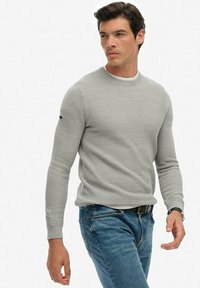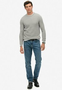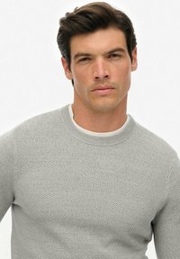 Man met een gestructureerde lichtgrijze trui, blauwe jeans, zwarte riem en polshorloge, staat met gekruiste armen tegen een effen achtergrond.