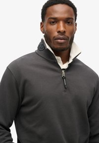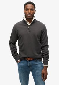Grijze zip-up sweatshirt met hoge kraag, voorzien van lange mouwen en een contrasterende binnenkraag. Gedragen met blauwe jeans en een bruine riem.