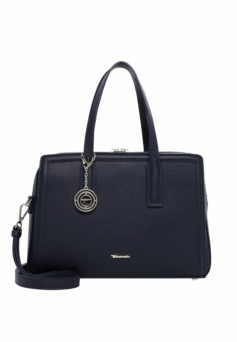 Rechthoekige handtas in marineblauw met twee handvatten, afneembare schouderband, zilveren rits en een ronde zilveren hanger aan een van de handvatten.