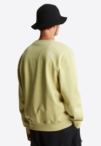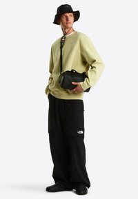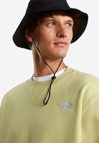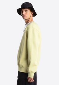 Lichtgele sweatshirt met lange mouwen en een ronde hals, voorzien van een klein wit logo. Draagt bij zwarte korte broek en een zwarte vissershoed.