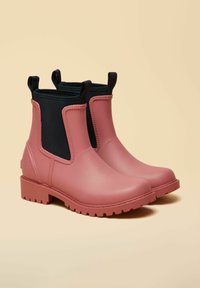 Zwarte rubberen Chelsea-boot met een matte afwerking, elastische zijpanelen en een gestroomlijnde zool voor grip. Voorzien van een trekband voor gemakkelijk aan- en uittrekken.