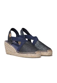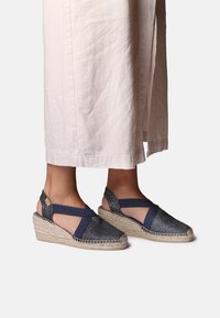 Voeten met marineblauwe sleehakken espadrilles met kruisgewijs geplaatste elastische banden, gecombineerd met lichtbeige wijde broekspijpen.