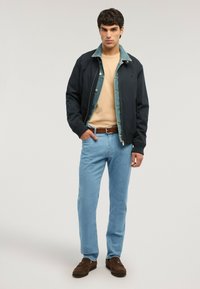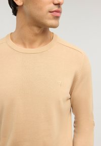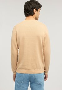 Jonge man met een beige trui met ronde hals en lichtblauwe spijkerbroek, staand met één hand in zijn zak tegen een effen lichte achtergrond.