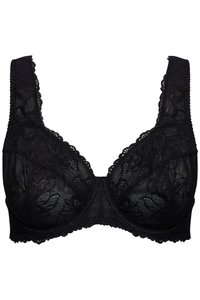 Marineblauwe kanten beha met florale patronen, transparante delen en bredere banden. Bevat een decoratieve middenstuk en een bijpassende kanten tailleband.