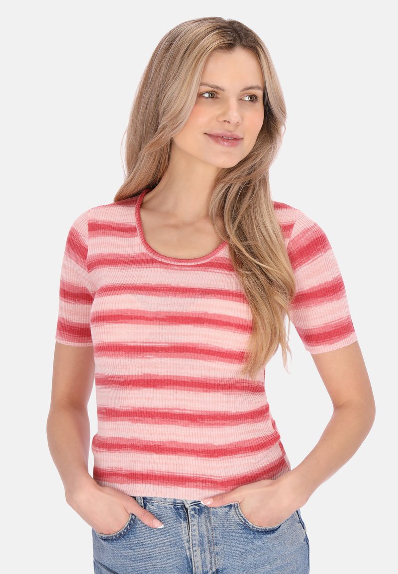 Gestreept T-shirt met korte mouwen in tinten roze en rood. Geribbelde textuur met een afgeronde halslijn en een aangesloten ontwerp. Casual, lichtgewicht stof.