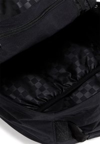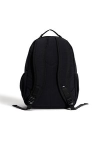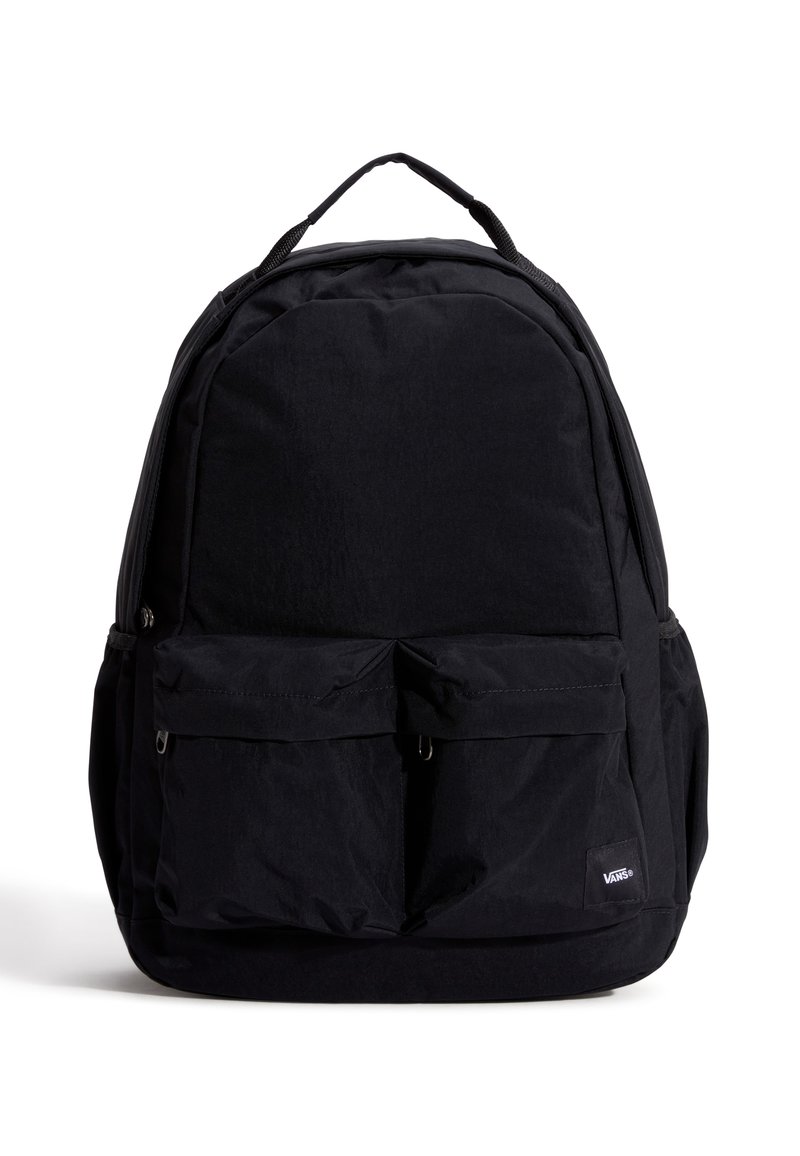 Zwarte rugzak met een gladde textuur, voorzien van een hoofdvak en twee voorste ritszakken. Eenvoudig ontwerp met een bovenhandvat.