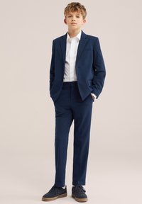 Jongen met lichtbruin haar, die een wit overhemd draagt met opgerolde mouwen, een zwarte vlinderdas en marineblauwe broek, staand tegen een neutrale achtergrond.