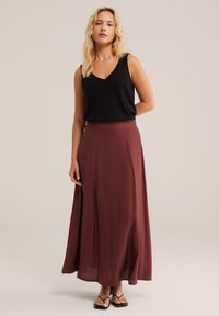 Blonde vrouw die een mouwloze zwarte top met structuur en een high-waisted bruine rok draagt, staand tegen een effen lichte achtergrond.