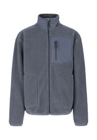 Fleecejack in donkergroen olijf, met een hoge kraag, ritssluiting aan de voorkant, twee grote zijzakken en een borstzak met een logo patch.