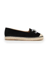 Espadrille-achtige schoen in beige suede, met een decoratieve edelsteenaccent aan de voorkant, en een met jute omhulde zool voor extra textuur.